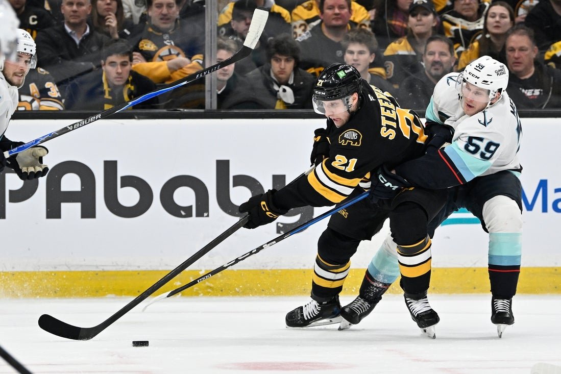15 Januari 2026. Boston, Massachusetts, AS. Selama periode pertama di TD Garden, center Boston Bruins Alex Steeves, 21, mengoper bola yang dijaga oleh center Seattle Kraken Ben Myers, 59. Kredit yang Diperlukan: Eric Canha-Imagn Images