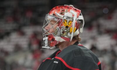 28 Mei 2025. Raleigh, Carolina Utara, AS. Penjaga gawang Carolina Hurricanes Pyotr Kochetkov, 52, melakukan pemanasan sebelum Game 5 Final Wilayah Timur Playoff Piala Stanley 2025...
