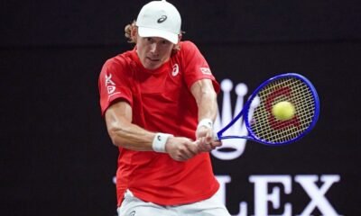 20 September 2025. San Francisco, California, AS. Pemain Tim Dunia Alex de Minaur mengembalikan bola dari pemain Tim Eropa Alexander Zverev selama Piala Laver di Chase...