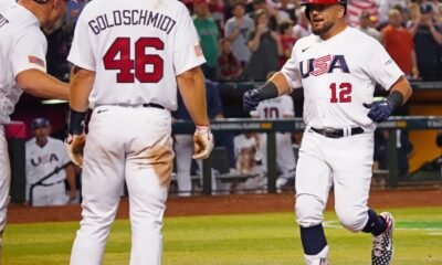Pemukul yang ditunjuk AS Kyle Schwarber (12) merayakan bersama Mike Trout (Kiri) dan Paul Goldschmidt (46) setelah melakukan home run pada inning ketiga melawan Inggris Raya...