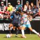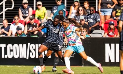 5 Oktober 2025; Washington, Distrik Columbia, AS. Penyerang Washington Spirit Rose Mond Core Sea (19) dan penyerang San Diego Wave FC Delphine Cas Carino (20) berjuang...