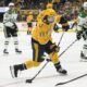 16 April 2025; Nashville, Tennessee, AS. Nashville Predator Wingluke Evangelista (77) menembakkan gol melawan Dallas Stars dalam masa jabatan ketiganya di Brideguesten Arena. Kredit yang Diperlukan:...