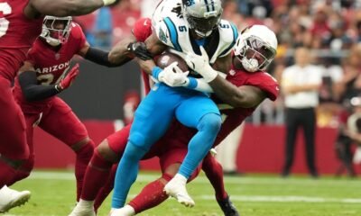Linebacker Arizona Cardinals Jordan Burch (52) sedang mengerjakan Carolina Panthers yang berlari melalui Rico Dowl (5) di Stadion State Farm pada 14 September 2025. Carolina Panthers...