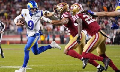 12 Desember 2024; Santa Clara, California, AS. Quarterback Los Angeles Rams Matthew Stafford (9) berjalan dengan bola sebagai linebacker San Francisco 49ers Fred Warner (54) bertahan...