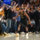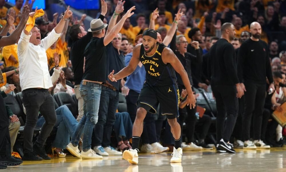 2 Mei 2025. San Francisco, California, AS. Guard Golden State Warriors Moses Moody, 4, bereaksi setelah melakukan tembakan tiga angka melawan Houston Rockets pada kuarter kedua...
