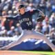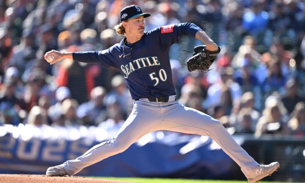 8 Oktober 2025. Detroit, Michigan, AS. Pelempar Seattle Mariners Bryce Miller (50) melakukan pukulan pada inning pertama Game 4 putaran ALDS Playoff MLB 2025 melawan Detroit...