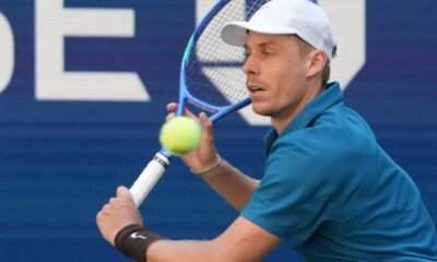 30 Agustus 2025. Flushing, New York, AS. Denis Shapovalov (Kanada) memukul Jannik Sinner (ITA) pada hari ke 7 Turnamen Tenis AS Terbuka 2025 di Pusat Tenis...