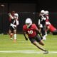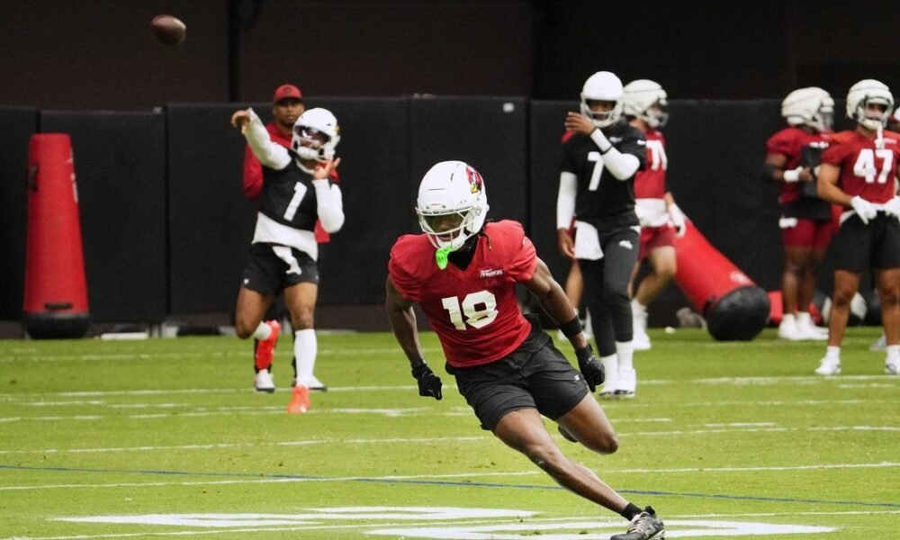 Quarterback Arizona Cardinals Kyler Murray, 1, memberikan umpan ke penerima lebar Marvin Harrison Jr., 18, selama kamp pelatihan di State Farm Stadium di Glendale pada 25...