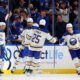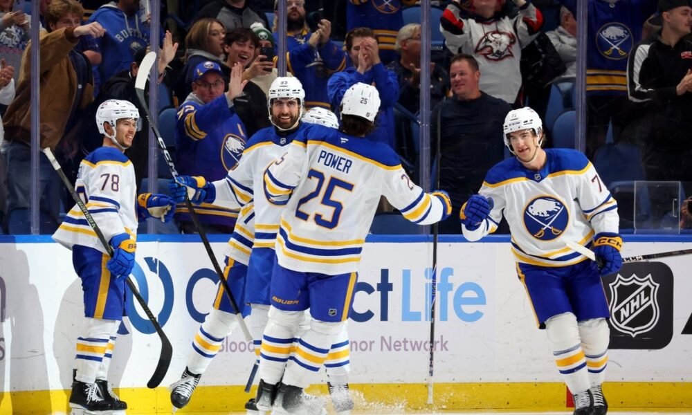 15 Oktober 2025. Buffalo, New York, Amerika Serikat. Center Buffalo Sabres Ryan McLeod, 71, merayakan gol keduanya dalam pertandingan tersebut bersama rekan satu timnya selama periode...