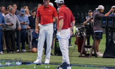Pegolf Tiger Woods dan Kevin Kissner akan melakukan pemanasan di Sophie Center sebelum pertandingan golf antara Jupiter Link dan Los Angeles Golf Club of TGL, liga...