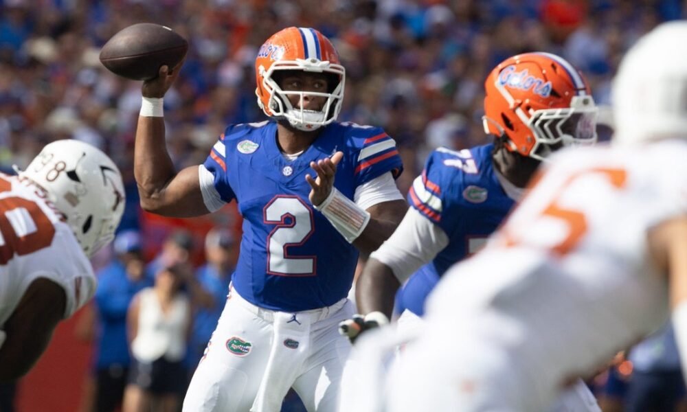 Quarterback Florida DJ Lugway (2) akan lulus dalam pertandingan sepak bola NCAA melawan Texas pada hari Sabtu, 4 Oktober 2025 di Gainesville, Florida. (Alan Young Blood/Gainesville...