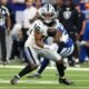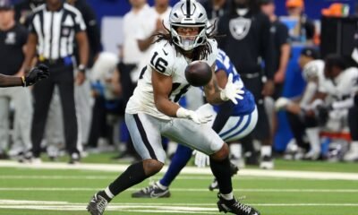 5 Oktober 2025. Indianapolis, Indiana, Amerika Serikat. Penerima lebar Las Vegas Raiders Jacobi Myers (16) melakukan tangkapan pada paruh kedua pertandingan melawan Indianapolis Colts di Stadion...