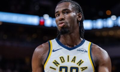 13 Oktober 2025. Indianapolis, Indiana, AS. Penjaga/penyerang Indiana Pacers Aaron Nesmith, 23, bermain di paruh pertama pertandingan melawan San Antonio Spurs di Gainbridge Fieldhouse. Kredit yang...